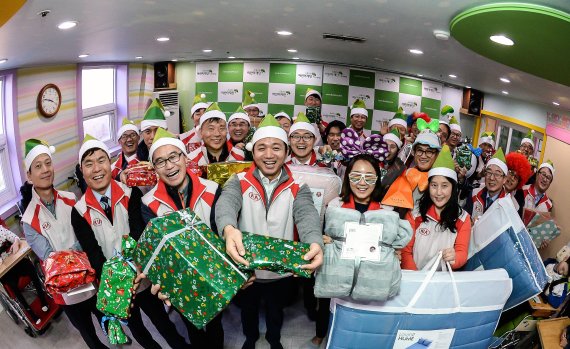 기아자동차 국내 영업본부 임직원 40여명이 지난 16일 경기 광주 '초록우산어린이재단 한사랑마을'에서 다양한 사회나눔활동을 펼쳤다. 중증장애인들과 크리스마스 트리.케이크 만들기, 생일 대상자 선물 이벤트, 시설 청소 등을 비롯해 모닝 차량, 기부금, 재활치료용품을 전달하는 행사를 가졌다. 기아차 임직원과 한사랑마을 중증장애인들이 기념촬영을 하고 있다.