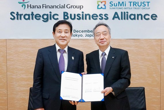 하나금융그룹이 일본 미쓰이스미토모신탁그룹과 고령화 시대 효율적 자산관리와 공동상품 개발을 위해 협력하기로 했다고 22일 밝혔다. 김정태 하나금융그룹 회장(왼쪽)이 지난 21일 일본 도쿄 미쓰이스미토모신탁그룹 본사에서 히토시 츠네카게 미쓰이스미토모신탁그룹 회장과 자산관리와 신탁업 등 리테일부문에 대한 업무제휴 확대를 위한 협약을 체결한 후 기념촬영을 하고 있다.