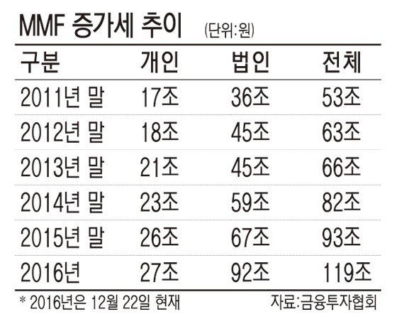 올해 개인 MMF 규모는 27조원으로 유지됐으나 기관은 67조원에서 92조원으로 증가했다.