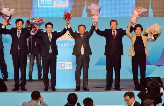바른정당 중앙당 창당대회가 24일 오후 서울 올림픽공원 내 올림픽홀에서 열려 정병국 신임 당대표와 최고위원들이 꽃다발을 든채 환호하고 있다./사진=서동일 기자