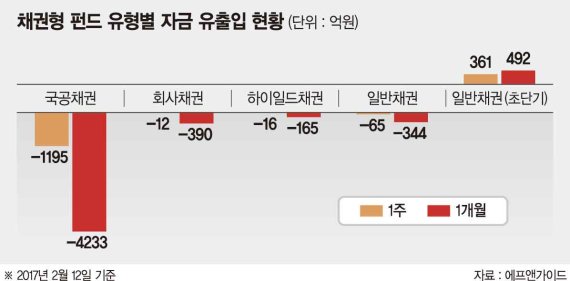 13일 펀드평가사 에프앤가이드에 따르면 지난 12일을 기준으로 한달간 초단기 채권형펀드를 제외한 나머지 유형별 채권형펀드에서는 모두 자금이 순유출됐다.
