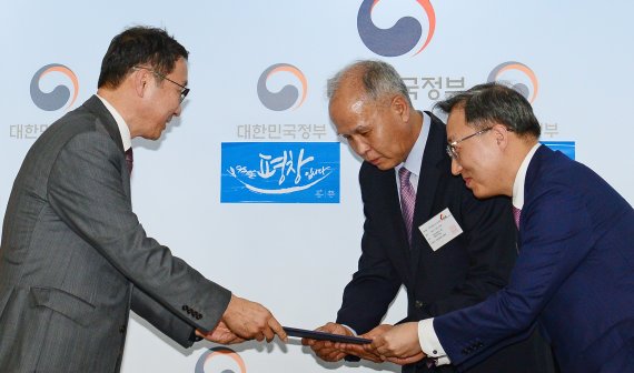 김학수 금융위원회 금융서비스 국장(왼쪽 첫번째)이 5일 세종대로 정부서울청사에서 열린 카카오뱅크 본인가 관련 브리핑에서 윤호영, 이용우 카카오뱅크 공동 대표(오른쪽부터)에게 은행업 인가증을 전달하고 있다. 사진=김범석 기자