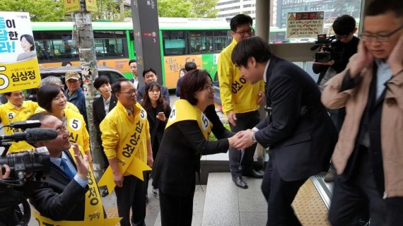머리가 덜 마른 30대 여성은 수줍게 심 후보와 악수했다. 뒤이어 검은 뿔테를 쓴 중년 남성은 심 후보와 오래도록 악수를 한 뒤 출근했다. 그러나 많은 직장인들은 출구 앞에 늘어선 카메라와 기자들, 선거 유세단에 놀라며 고개를 숙이고 달려 나가기도 했다.