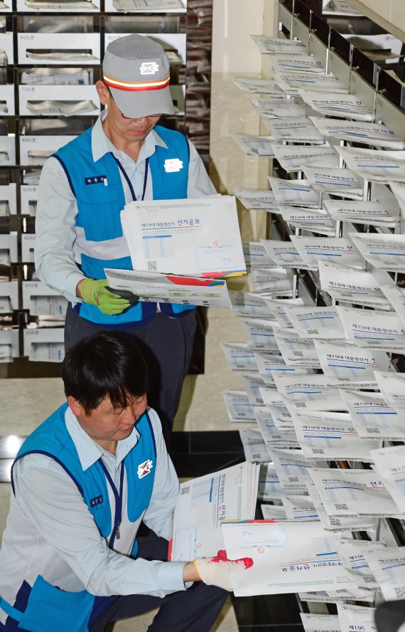 제19대 대통령선거가 15일 앞으로 다가온 24일 서울의 한 아파트에서 집배원들이 선거공보물을 각 가정의 우편함에 넣고 있다.
