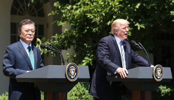 문재인 대통령이 30일 오전(현지시간) 워싱턴 백악관 로즈가든에서 열린 공동 언론 발표에서 도널드 트럼프 미국 대통령의 발언을 듣고 있다. 연합뉴스