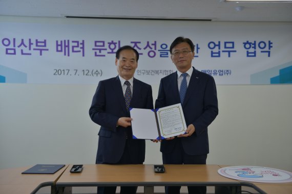 매일유업은 12일 서울 영등포 인구보건복지협회 사무실에서 '임산부 배려 문화 조성'을 위한 업무협약을 체결하고 이 협약 1호 기업으로 이름을 올렸다고 밝혔다.
