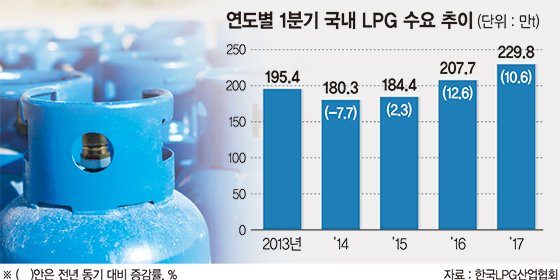이로써 1.4분기 국내 LPG 수요는 3년 연속 성장세를 이어갔다. 국내 1.4분기 LPG 수요는 2014년 180.3만t으로 전년보다 7.7% 급감했다가 2015년 184.4만t(2.3%), 2016년 207.7만t(12.6%)으로 증가했다.