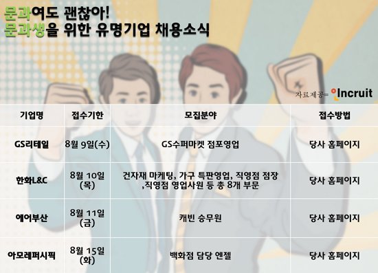 문송한 그들의 취업을 돕기 위해, 취업포털 인크루트가 문과생들이 도전할 수 있는 유명한 기업들의 채용 소식을 7일 전한다.