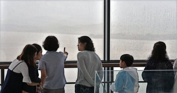 15일 비가 오는 궂은 날씨에도 경기도 파주시 오두산 통일전망대를 찾은 관광객들이 북한 황해북도 개풍군 일대 쪽을 바라보고 있다./사진=서동일 기자