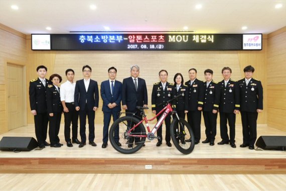 자전거 전문 기업 알톤스포츠가 지난 18일 충북 청주동부소방서에서 충청북도소방본부와 업무제휴 협약식(MOU)을 가졌다. 김신성 알톤스포츠 대표(왼쪽 여섯번째)와 김충식 충북소방본부장(왼쪽 일곱번째)이 지난 18일 충북 청주동부소방서에서 충청북도소방본부와 업무제휴 협약식(MOU)을 갖고 관계자들과 기념사진을 촬영하고 있다.