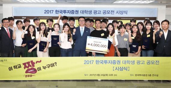 한국투자증권은 지난 24일 서울 여의도 본사에서 ‘2017 한국투자증권 대학생 광고공모전(TFAA)’ 시상식을 개최했다. 한국투자증권의 기업이미지를 주제로 한 이번 광고공모전에는 전국 83개 대학에서 191개 팀이 참가했으며, 참신하고 개성 있는 15개 작품이 수상작으로 선정됐다. 유상호 한국투자증권 사장(앞줄 왼쪽 일곱번째), 이희주 커뮤니케이션 본부장(앞줄 오른쪽 첫번째), 권문석 덴츠코리아 상무(앞줄 왼쪽 첫번째)가 수상자들과 기념촬영을 하고 있다.