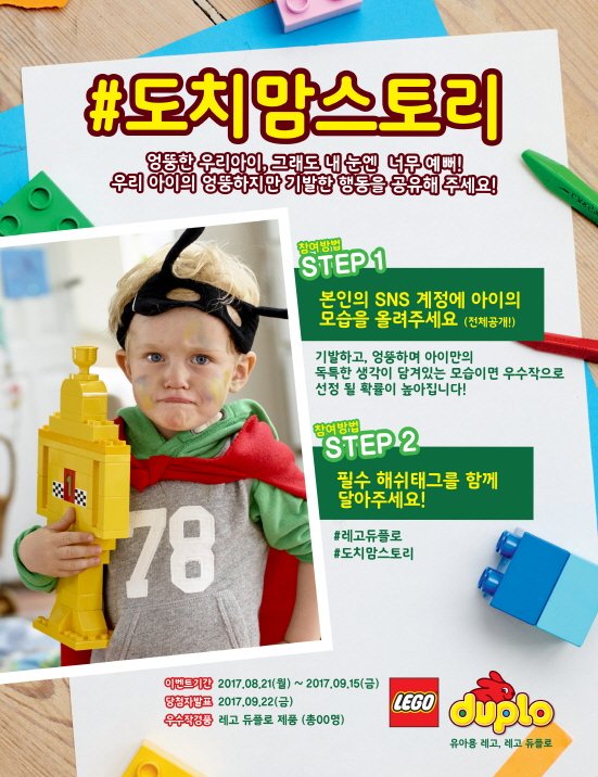 또 캠페인 기간 동안 아이들의 엉뚱하고 기발한 행동을 사진이나 영상으로 촬영해 해시태그(#레고듀플로, #도치맘스토리)와 함께 개인 SNS에 업로드하면 추첨을 통해 10만원 상당의 레고 듀플로 신제품 등을 경품으로 증정할 예정이다.