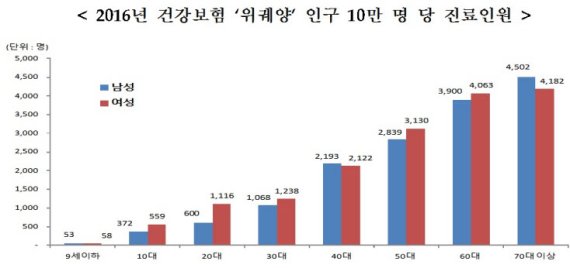 위궤양 환자는 전체적으로 숫자가 감소하고 있지만 40대 이상에선 급격히 증가하고 있다.