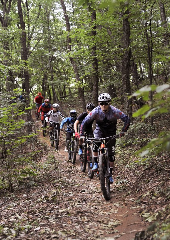 지난 3일 경기도 성남시 분당구 대장동에서 진행된 다운힐 라이딩 커뮤니티 프로그램에 MTB 국가대표 출신인 트렉 컨셉스토어 루트바이크 장준원 대표가 동호인들과 함께 라이딩을 하고 있다. /사진=트렉바이시클코리아
