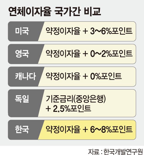 기한이익이 존속한 상태에서 미납 상환액에만 붙는 지연 수수료도 한국은 약정이자율보다 5∼7%포인트 더 붙어 미국(약정이자율+3∼6%포인트), 영국(약정이자율+0∼2%포인트), 호주(약정이자율+2∼5%포인트) 등보다 높다.