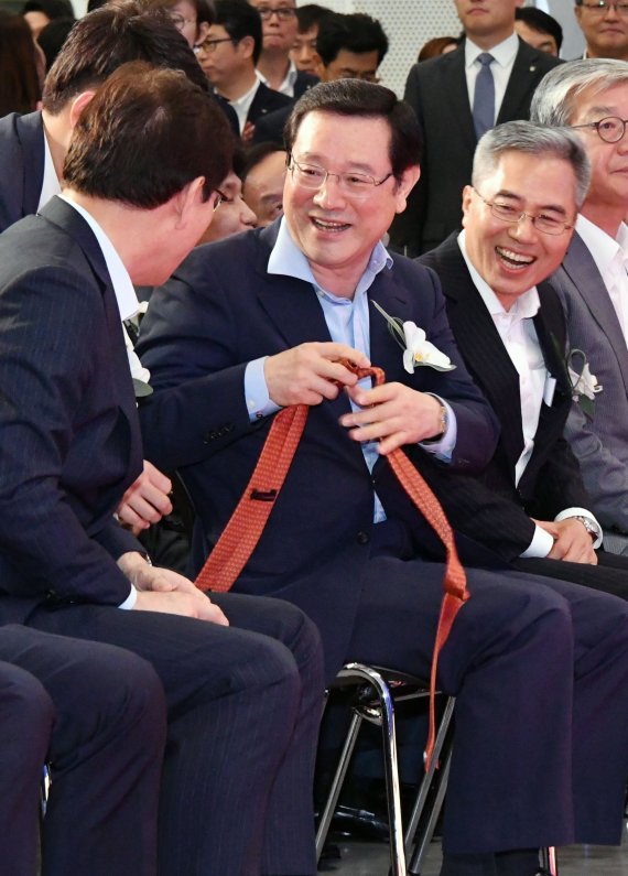 13일 오전 서울 을지로 동대문디자인플라자에서 열린 '금융권 공동 채용박람회'에서 이용섭 일자리부위원장(가운데)이 다른 참석자들과 드레스코드를 맞추기 위해 메고 있던 넥타이를 풀자 최종구 금융위원장(왼쪽)과 하영구 은행연합회장(오른쪽)이 밝은 표정을 짓고 있다./사진=서동일 기자