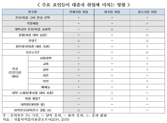 또 인문계열보다는 사회과학, 공학, 자연계열 등 전공 졸업자들의 취업가능성이 더 높고, 어학연수의 경우 대기업 취업에는 도움이 됐지만 중소기업 취업에는 큰 영향을 미치지 못했다. 대학 소재지에 있어서는 서울권 대학 졸업자의 경우 비(非)서울권 대학 졸업자보다 상대적으로 취업가능성이 높았고, 학점은 높을수록 취업가능성도 함께 높아지는 것으로 분석됐다.