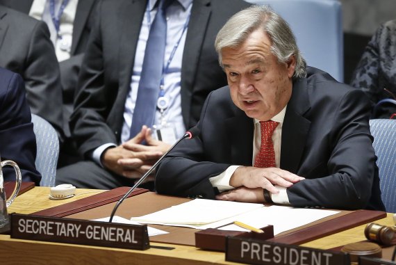 안토니오 구테흐스 유엔 사무총장이 28일(현지시간) 미국 뉴욕 유엔본부에서 열린 안전보장이사회 회의에 출석해 미얀마 정부의 로힝야족 인종청소를 성토하고 있다. AP연합뉴스