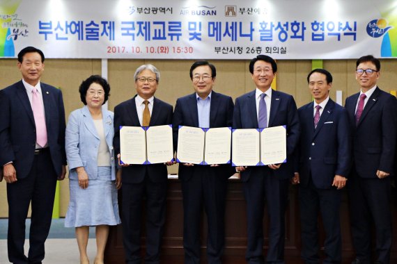 지난 10일 부산시청에서 열린 부산예술제 국제교류 및 세미나 활성화 협약식에서 서병수 부산시장(왼쪽 네번째)과 한태근 에어부산 사장(왼쪽 다섯번째), 김동석 부산예술문화단체총연합회 회장(왼쪽 세번째) 등이 협약서를 들고 기념촬영을 하고 있다.