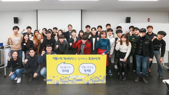 청년상인과 대학생 창업가 50여명이 지난 3일 서울 공덕동 서울창업허브에서 열린 '제3회 전통시장 청년상인과 함께하는 토크버스킹'에 참석해 기념사진을 촬영하고 있다. /사진=소상공인진흥공단