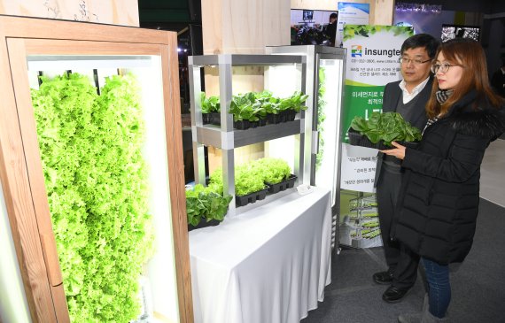 5일 농림축산식품부 주최로 '2017 생명산업과학기술 대전'이 서울 강남대로 aT센터에서 개막했다. '사람과 생명의 가치를 높이는 스마트 미래농업'이라는 주제로 사흘간 열린다. 관람객들이 발광다이오드(LED) 스마트 온실에서 재배된 채소를 보고 있다.