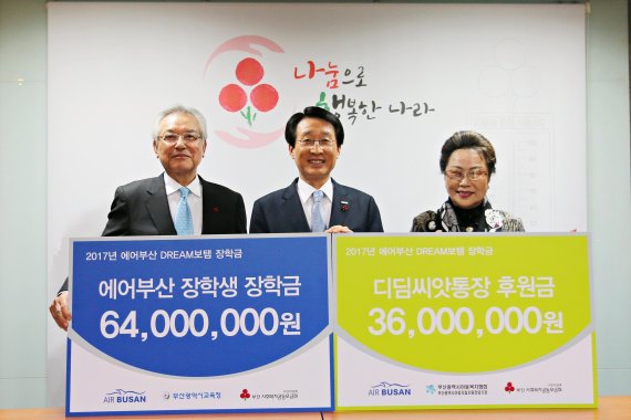 지역항공사 에어부산은 21일 오전 부산 동구 부산사회복지공동모금회에서 청소년의 꿈을 응원하는 '드림보탬 장학금' 전달식을 가졌다. 이날 전달식에는 에어부산 한태근 사장, 부산사회복지공동모금회 신정택 회장, 부산시아동복지협회 김삼진 협회장과 장학생 대표 등이 참석했다. 에어부산은 부산지역 고등학생 장학금과 아동을 위한 디딤씨앗통장 후원금 등 총 1억원을 기부했다. 신 회장, 한 사장, 김 협회장(왼쪽부터)이 기념사진을 찍고 있다.