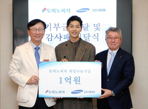 이날 삼성서울병원에서 열린 기부금 전달식에는 오광현 한국 도미노피자 회장, 권오정 삼성서울병원 원장, 모델 송중기가 참석했다.