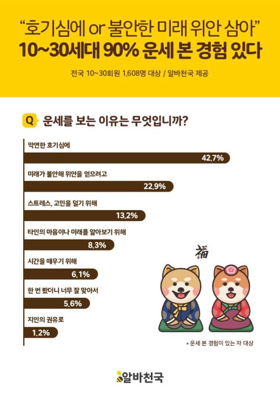 아르바이트 전문 포털 알바천국이 전국 회원 1608명을 대상으로 ‘운세 보시나요?’에 대한 설문조사를 실시해 결과를 8일 발표했다.