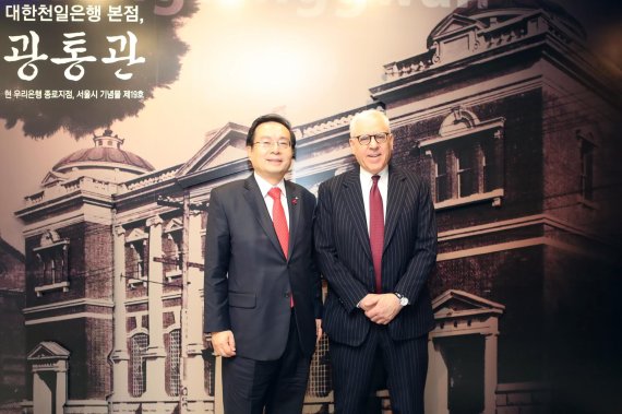 손태승 우리은행장은 지난 17일 서울시 중구 본점에서 세계 최대 사모펀드 운용사 중 하나인 칼라일그룹의 데이비드 루벤스타인 공동회장을 만났다. 손행장(왼쪽)이 루벤스타인 공동회장과 기념촬영을 하고 있다.