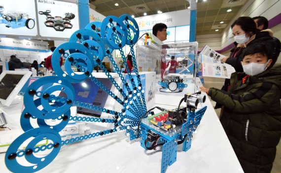 대한민국 교육박람회가 교육부 주최로 24일 서울 영동대로 코엑스에서 열려 전시장을 찾은 어린이들이 코딩용 로봇을 작동해보고 있다. 대한민국 교육박람회는 26일까지 계속된다./사진=서동일 기자
