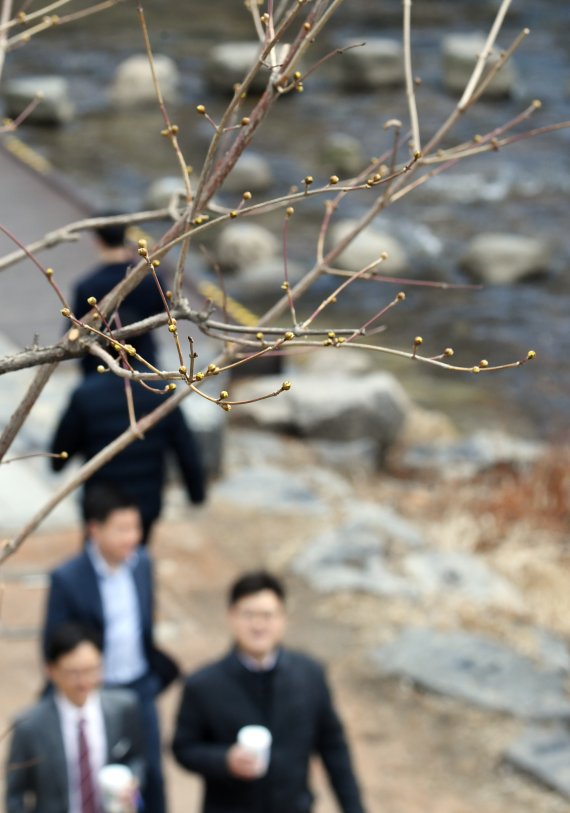 경칩을 하루 앞둔 5일 서울 청계천변에 심어진 산수유나무 꽃눈 너머로 시민들이 산책을 하고 있다. 사진=