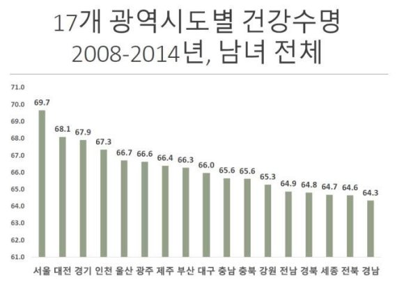 한국건강형평성학회는 2004~2015년 건강보험 데이터를 이용해 '지역별 건강불평등 현황'을 조사한 결과, 지난 2014년을 기준으로 건강수명이 가장 높은 지역은 서울시로 평균 69.7세였으며 가장 낮은 지역은 경상남도(64.3세)로 5.4세나 차이가 있는 것으로 나타났다고 26일 밝혔다. 건강수명은 평균수명 중 건강하게 삶을 유지하는 기간을 말하며 기대수명은 향후 몇 살까지 살 것인지 기대되는 평균 생존년수를 지칭한다.
