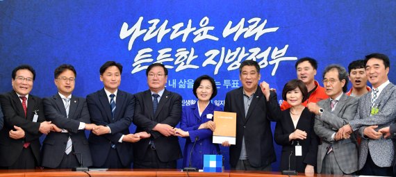 최승재 소상공인연합회장(오른쪽 네번째)이 24일 오후 국회 더불어민주당 당대표회의실에서 추미애 대표에게 정책제안서를 전달하한 후 관계자들과 기념촬영 하고 있다./사진=서동일 기자