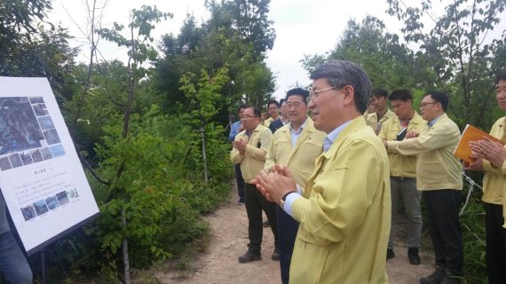 류광수 산림청 차장(맨앞)이 포항시 북구 용흥동 산110-10번지 일원 땅밀림 발생지를 현장점검 하고 있다.