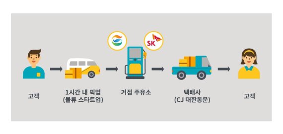 따라서 홈픽을 이용하는 고객이 네이버, 카카오톡, CJ 대한통운 앱, 홈픽 홈페이지 등으로 택배를 접수하면 중간 집하업체(물류 스타트업)가 1시간 이내에 고객을 찾아가 물품을 픽업해 거점 주유소에 집하·보관하고, 이를 CJ대한통운이 배송지까지 운송하는 체계로 이뤄진다.