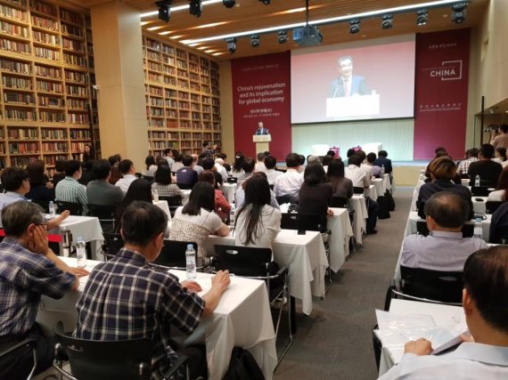 한국고등교육재단이 3일 서울 역삼동 재단 컨퍼런스홀에서 연 중국석학 초청강연에서 린이푸 베이징대 교수(전 세계은행 부총재)가 강연을 하고 있다.