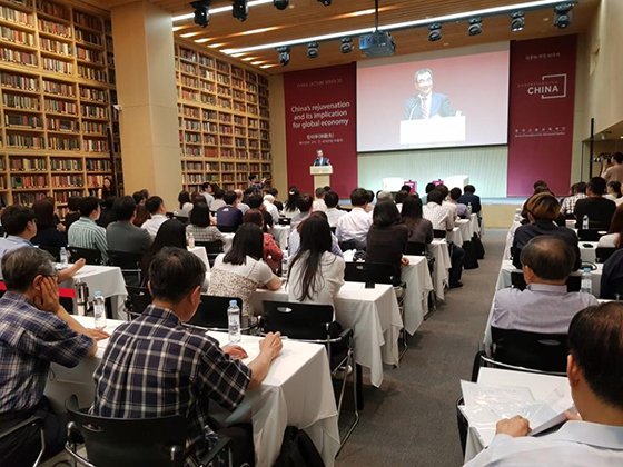 한국고등교육재단이 3일 서울 테헤란로 재단 컨퍼런스홀에서 연 중국석학 초청강연에서 린이푸 베이징대 교수(전 세계은행 부총재)가 강연을 하고 있다.