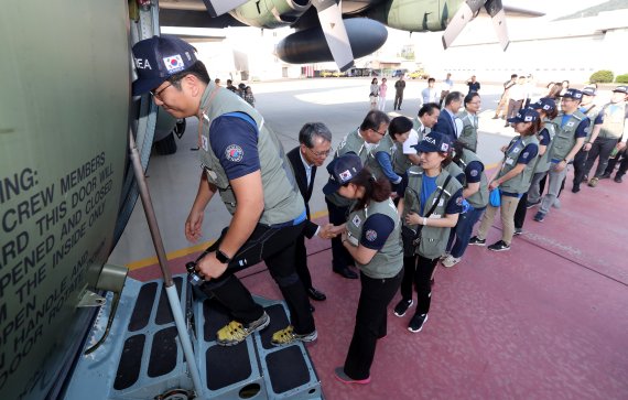29일 오전 경기도 성남시 서울공항에서 대한민국긴급구호대(KDRT) 대원들이 출정식을 마친뒤 수송기에 탑승하고 있다. 라오스 세피안-세남노이 댐 사고지원을 위해 파견된 구호대는 현지 지역 주민의 감염병 예방 및 치료 활동을 할 계획이다. 사진공동취재단 연합뉴스