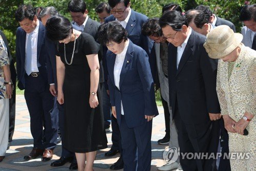 민주평화당 조배숙 대표가 31일 오전 동작구 국립서울현충원에 있는 김대중 전 대통령 묘역을 참배하고 있다. 연합뉴스.