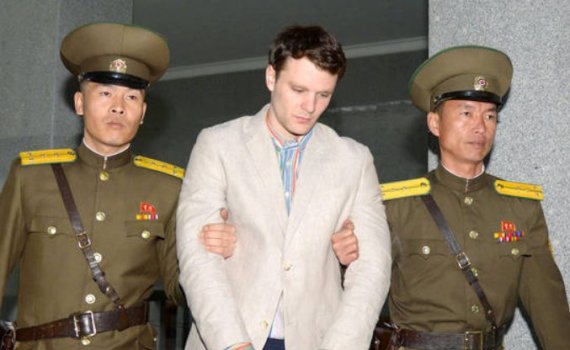 미국 국무부는 미국인의 북한 여행금지 조치를 1년 연장했다. 미국인 대학생 오토 웜비어(사진 중앙)의 모습. 웜비어는 북한 여행하던 중 북한당국에 억류된 뒤 혼수상태 상태로 풀려났지만 미국에 도착한 이후 사망했다. /사진=연합뉴스