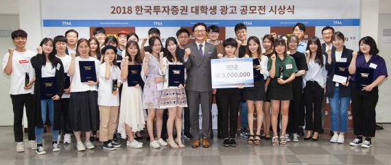 한국투자증권은 최근 서울 여의도 본사에서 ‘2018 대학생 광고공모전(TFAA)’ 시상식을 개최했다. 올해로 3회째를 맞은 광고공모전은 한국투자증권의 기업이미지를 주제로 영상광고와 인쇄광고로 나눠 진행됐으며, 전국 66개 대학 90개팀이 총 149작품을 출품했다. 유상호 한국투자증권 사장(앞줄 가운데)이 수상자들과 기념촬영을 하고 있다.
