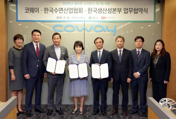 코웨이는 지난 14일 서울 서소문로 본사에서 한국수면산업협회 및 한국생산성본부와 '건강하고 올바른 수면환경 제안'을 위한 업무협약을 체결했다고 17일 밝혔다.