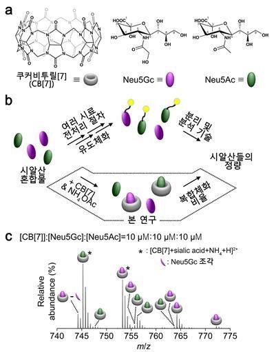 우리 몸에서 합성되지 않지만 바이오의약품 속에 다량 포함되어 있는 시알산의 정량 분석 방법이 보고되었다. 고려대 김준곤 교수와 충남대 안현주 교수 연구팀이 주인-손님 화학을 이용해 인간이 아닌 포유류의 시알산을 유도체화하지 않고 분석해내는 방법을 제시했다고 한국연구재단이 18일 밝혔다.
