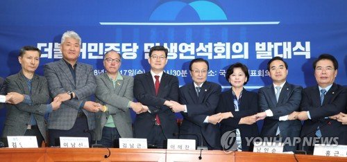 더불어민주당 이해찬 대표(오른쪽 네번째)가 17일 오전 국회에서 열린 '민생연석회의' 출범식에서 불공정 카드수수료 개선·건설노동자노후보장·하도급납품대금조정·주택임대차보호강화·편의점주최저수익보장 등의 5대 과제 추진 방향을 발표한 뒤 참석자들과 손잡고 있다. /연합뉴스