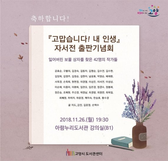 [고양=강근주 기자] 고양시 도서관센터는 26일 저녁 7시30분 아람누리도서관에서 자서전 창작 프로젝트 ‘고맙습니다, 내 인생’ 출판기념회 및 출간 책 전시 오프닝 행사를 진행했다.