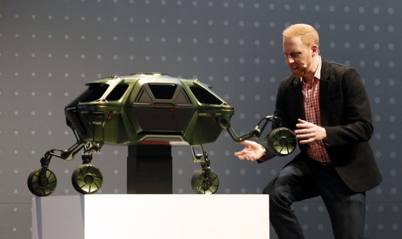 미국 라스베이거스에서 열린 '소비자가전쇼(CES) 2019'에서 7일(현지시간) 열린 ‘2019 현대자동차 프레스 컨퍼런스’에서 산업디자인 컨설팅 회사 '선드벅페라'의 디자인&혁신 전략 매니저 데이비드 바이론이 걸어 다니는 자동차 '엘리베이트' 콘셉트카를 소개하고 있다. 연합뉴스