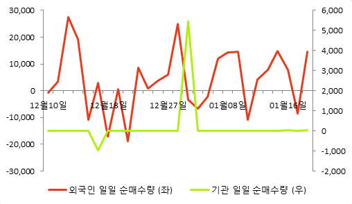 외국인, 기관 모두 보유량 증가 (5일 누적)최근 5일간 동종목의 외국인 투자자는 36,690주 순매수하였고 마찬가지로 기관은 32주 순매수하였다. 전날 두 주체 각각 14,595주, 32주 순매수하며 보유 비율을 늘렸다.