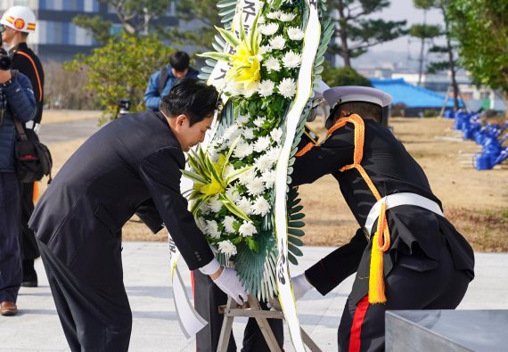 [제주=좌승훈 기자] 원희룡 제주도지사가 1일 오전 제100주년 3·1절 기념 만세대행진 행사에 참석한 데 이어 제주시 조천항일기념관에 있는 애국선열추모탑에 헌화와 분향을 하고 있다. [사진=제주도 제공]