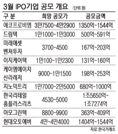 3월 기업공개(IPO) 시장이 대어들의 등장으로 눈길을 끌고 있다. 최대 1조7000억원으로 예상되는 한국리테일홈플러스리츠를 비롯해 현대오토에버 등 공모금액 1000억원이 넘는 기업들이 대거 상장을 추진 중이다. 공모금액이 2조원을 넘어설 것으로 기대된다.