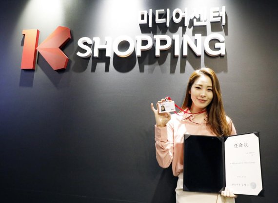 K쇼핑은 만능 스포테이너 신수지와 함께 모바일 콘텐츠 강화를 통한 2030세대 잡기에 나선다. 지난 6일 목동 K쇼핑 미디어센터에서 진행된 크리에이터 임명식에서 신수지씨가 기념 촬영을 하고 있다.